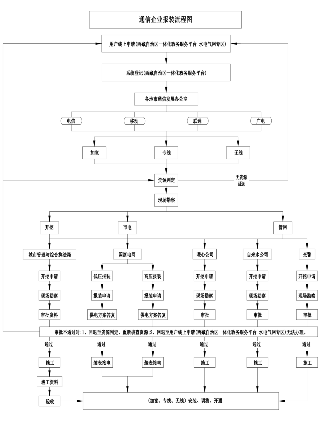 (二)西藏自治区一体化政务服务平台线上或线下服务窗口审核报装信息,材料合格,报装信息推送至各基础电信企业营业受理平台,各基础电信企业根据具体业务需求办理相关流程。